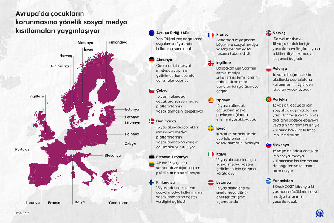 Avrupa’da gittikçe daha fazla ülke, çocuk ve gençlerin internette kontrolsüz şekilde vakit geçirmesinin yol açtığı riskleri azaltmak amacıyla sosyal medya kullanımına yönelik yeni kısıtlamalar ve düzenlemeler üzerinde çalışmayı sürdürüyor.