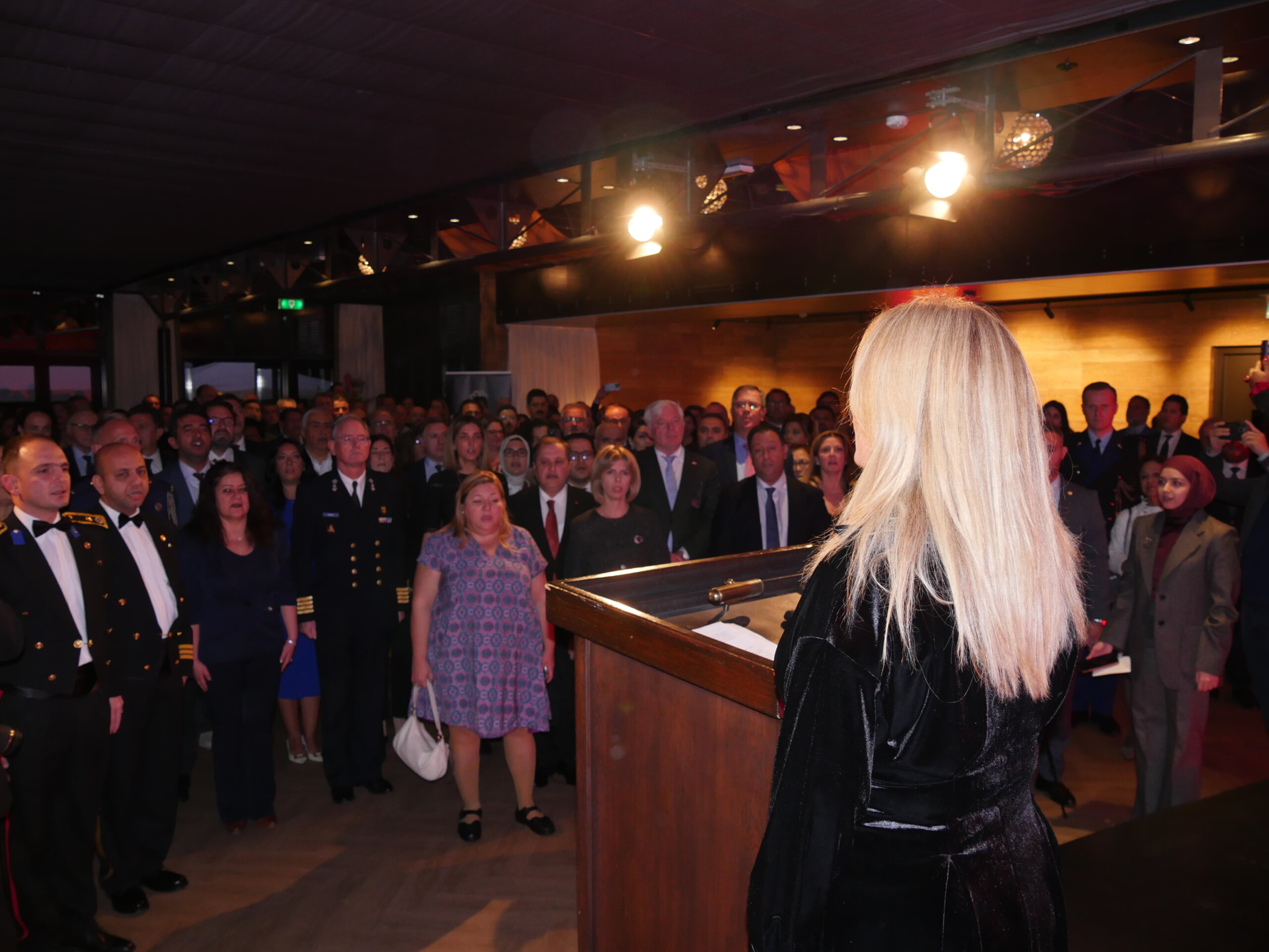 Hollanda’da 29 Ekim Cumhuriyet Bayramı dolayısıyla düzenlenen resepsiyon, Kasteel de Wittenburg’un tarihi atmosferinde coşku ve gururla kutlandı. Türkiye’nin Lahey Büyükelçisi Fatma Ceren Yazgan’ın ev sahipliğinde gerçekleşen programa, Askeri Ataşe Deniz Yarbay Umut Gökaslan, Eğitim Müşaviri Doç. Dr. Miyase Koyuncu Kaya, İletişim Müşaviri Doç. Dr. İsmail Erkam Sula, Hollanda’daki NATO Müttefik Müşterek Kuvvet Komutanlığı’nda görev yapan Türk askerleri, başkonsoloslar, sivil toplum kuruluşlarının temsilcileri, büyükelçilik çalışanları ve çok sayıda davetli katıldı.