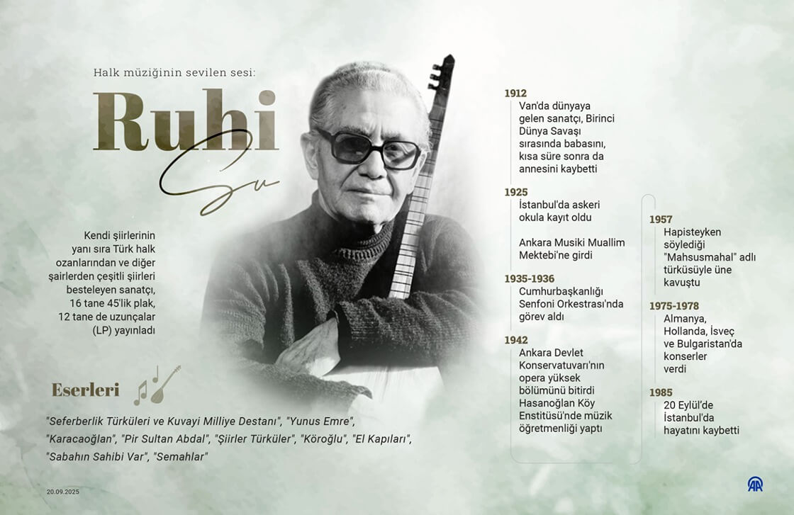 Halk müziğinin sevilen sesi: Ruhi SuKendi şiirlerinin yanı sıra Türk halk ozanlarından ve diğer şairlerden çeşitli şiirleri besteleyen sanatçı, 16 tane 45’lik plak, 12 tane de uzunçalar (LP) yayınladı. (Grafik: Efnan İpşir/AA)
