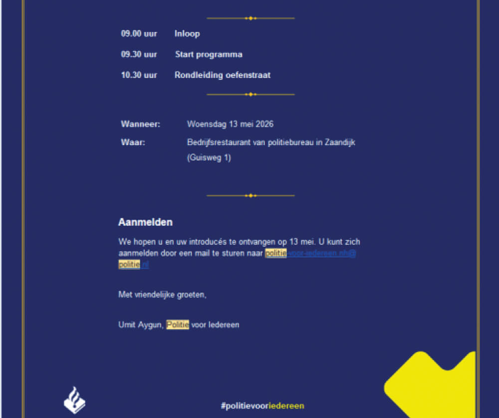Mahalledeki ağınız sayesinde, yeni meslektaşların işe alımında da bizim için büyük önem taşıyorsunuz. Bu nedenle 13 Mayıs 2026’da bir kahve molası düzenliyoruz. Gençlik çalışanları veya okullardan stajyer gözetmenleri gibi ilginç bir destek tabanına sahip bir veya iki kişiyle birlikte katılmaya davetlisiniz. Bir fincan kahve veya çay eşliğinde, size kuruluşumuz hakkında bilgi verecek, polis teşkilatında çalışmanın ne anlama geldiğini açıklayacak ve başvuru olanaklarını ele alacağız. Elbette, soru sormak ve sohbet etmek için de bolca fırsatınız olacak. Toplantıdan sonra, polis meslektaşlarımızın düzenli olarak gerçek hayattaki durumları uyguladıkları eğitim caddemizin ilham verici bir turunu size sunacağız.