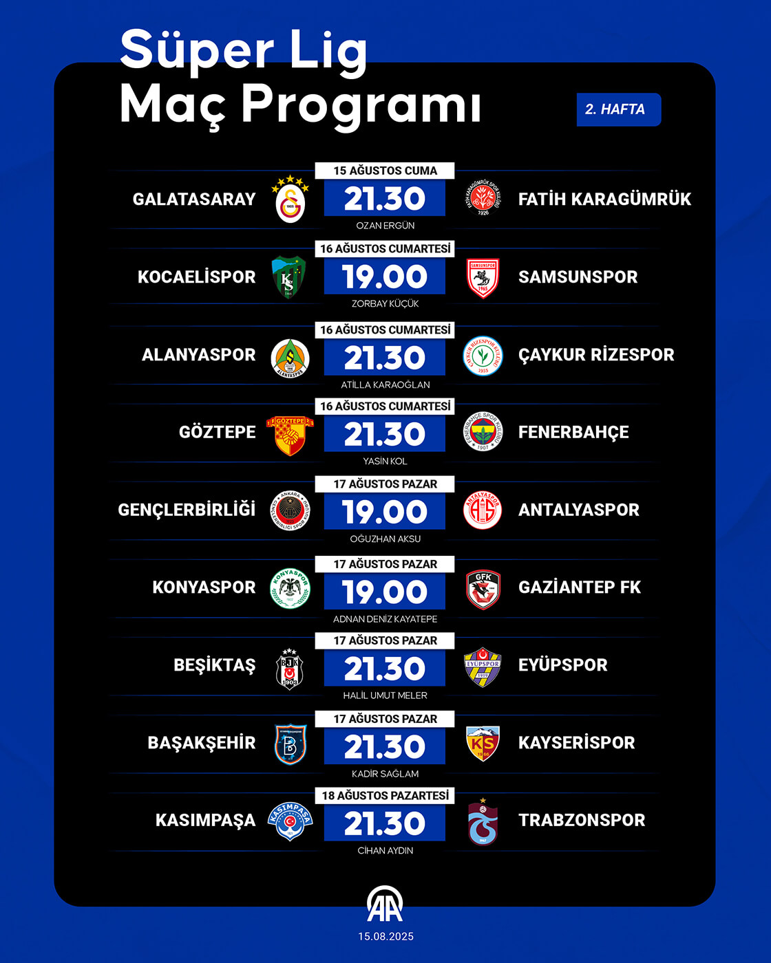 Trendyol Süper Lig’de 2. hafta maçları 15 Ağustos Cuma günü oynanacak Galatasaray-Fatih Karagümrük maçıyla başlayacak.